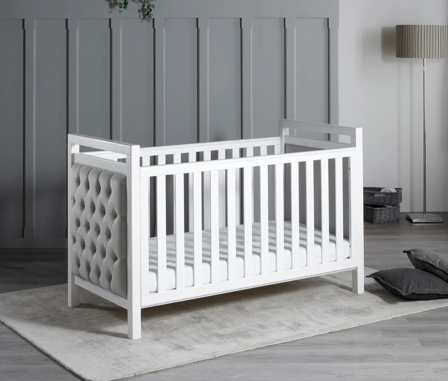 The Velvet Deluxe cot to toddler bed is all about both cosiness and comfort for your baby. The headboard and footboard are deeply cushioned, giving an ideal place for your little one to sit up and relax once they get older. The luxurious diamante button detailing, combined with the soft velvet upholstery, give this modern cot bed a modern feel that will complement any nursery. The fabric is water resistant and durable, making keeping it clean very simple. A teething rail is installed on either side to help prevent marks in the wood from teething children.