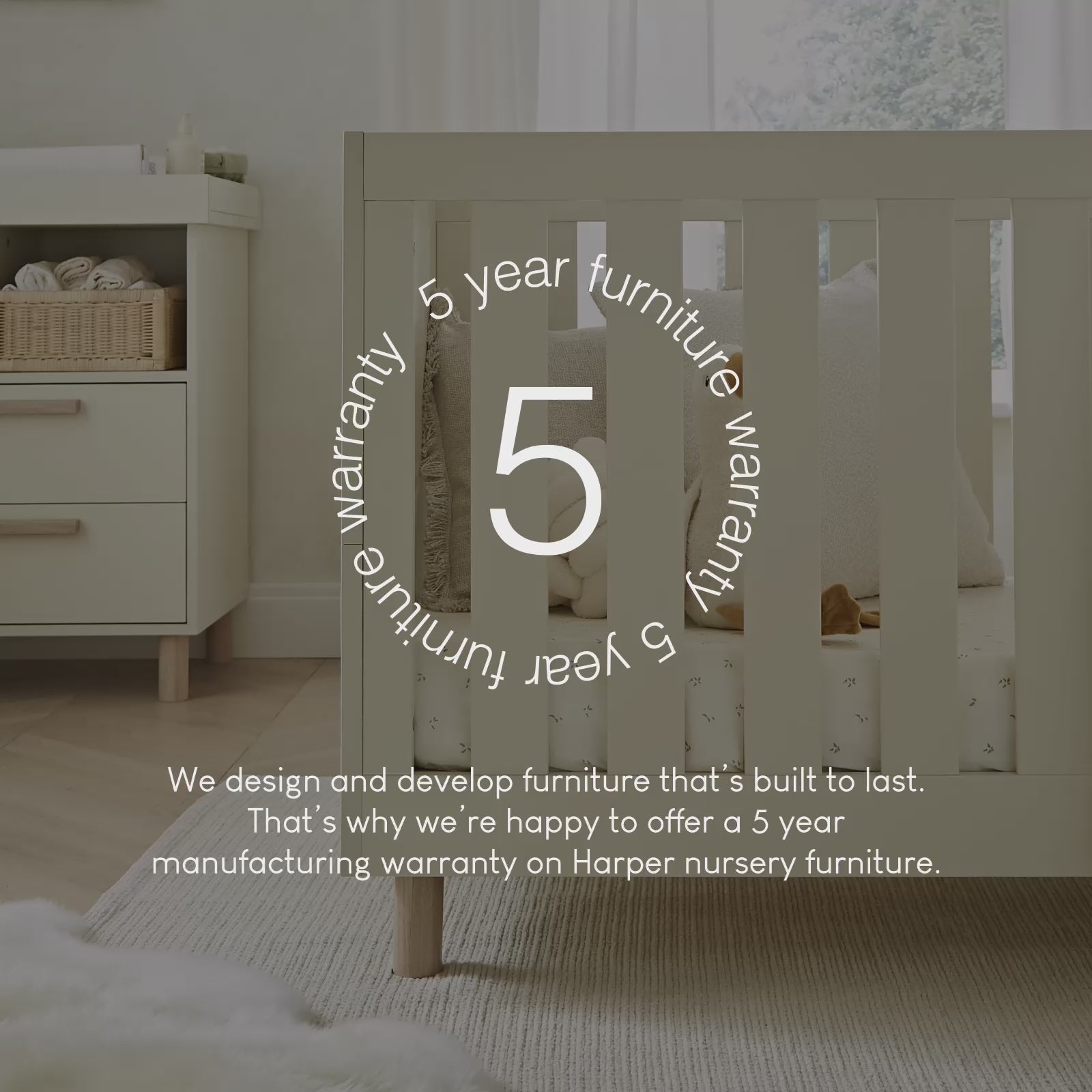 Add style and function to your little one’s nursery with The Harper cot bed. Coming in a contemporary design with sleek, clean lines and a calming colour palette of soft ash and cream, this bed blends effortlessly with your modern nursery decor. Built with 3 mattress positions, the Harper cot bed is designed with your baby’s safety in mind to adjust to their sleep needs as they develop from a newborn all the way to 5 years old, making it the perfect transition bed. As your baby grows, easily transition the cot bed into a toddler bed to give your little one the space they need to stretch and wiggle comfortably as they sleep.