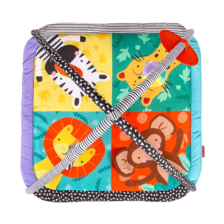 Bright and modern new addition to the Red Kite play range. Cute friendly characters on a padded play mat will keep young babies amused and happy. Features special white and black patterns designed to stimulate baby with their first recognisable colour. Detachable arches with hanging toys that include rattles and crinkle activities. Large reflective mirror that can be adjusted for baby to see their own reflection. Includes a reversible tummy time prop pillow with loops to attach any of the fun play toys.