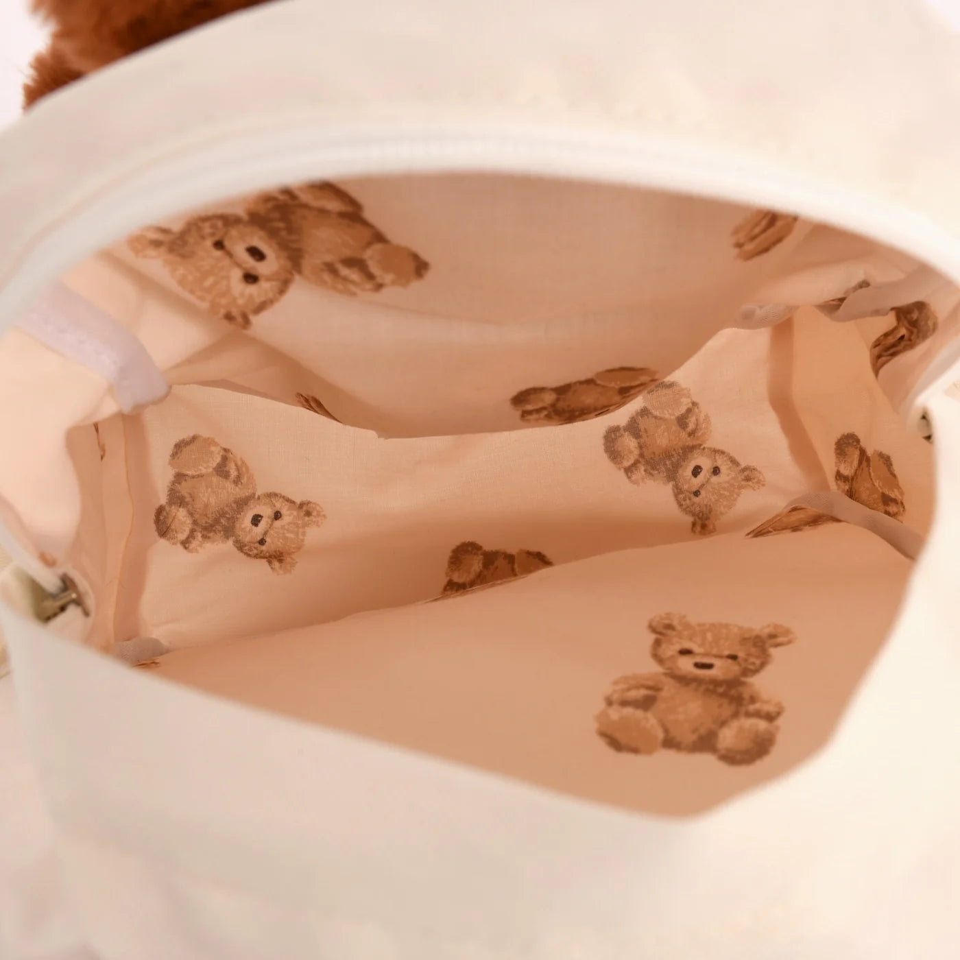 The Roma Teddy Rucksack is the ideal companion for school or day trips! Designed for children, this adorable rucksack combines practicality with charming aesthetics, making it a favourite among little ones. This rucksack features an adorable, removable teddy bear dressed in a cute, cozy outfit, making it a delightful companion for children.