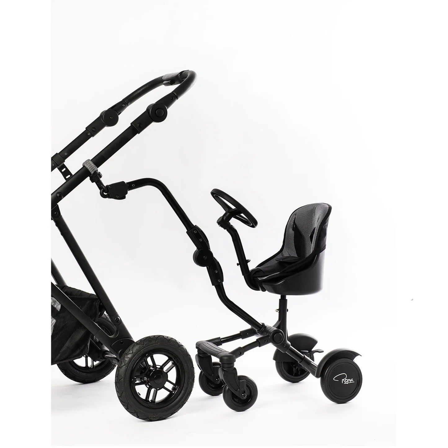 The Roma 4 Rider attaches to the axle of your pram and your child rides in front of you, whilst the Roma Uptown Rider and the Side Rider attaches to the side of your pram chassis so your child rides to the side. The Side Rider has a lay back seat unit, hood and includes the rain cover. All have 4 wheels for extra stability.